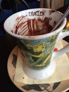 Acum am incercat la Rendez Vous, unde au ciocolata Eraclea si in meniu este trecuta la fel, ciocolata neagra amaruie. Bineinteles ca a fost o floscaiala totala, neamestecata bine, cu ditamai motul de frisca sintetica si niste bombonele de 2 lei peste. Iar ciocolata ce sa vezi? Era sortimentul cu smochine si nuci.
