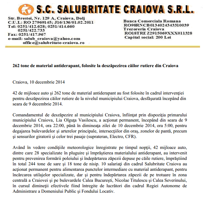 pentru deszăpezirea căilor rutiere de la nivelul municipiului Craiova, desfășurată începând din